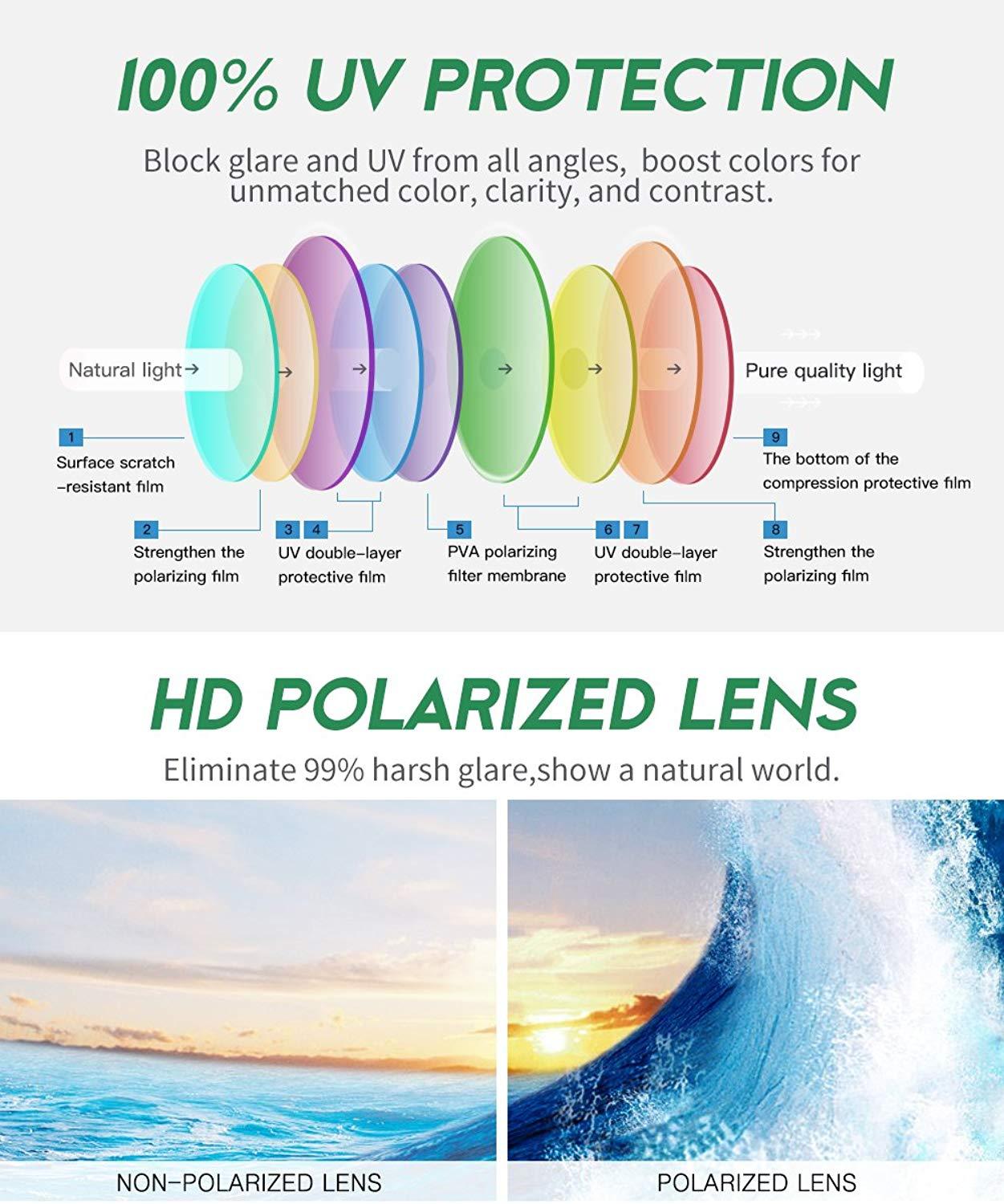 • Features: Polarized: Polarized lenses eliminate or reduce glare. Our lenses are specially designed to offer 100% UVA and UVB protection even in intense lighting conditions. Without polarized protection, depth perception is reduced, distorted view and color perception occur, and in some cases, you could be temporarily blinded. Polarization is useful for many outdoor activities including driving, extreme sports, water sports, and fishing. The benefits of polarized sunglasses are endless and can save your vision!