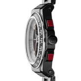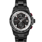 Edgy and bold design inspired by the pursuit of the thrill is represented in this “blacked-out” Otto Chrono style with black ionic plated solid steel case, and black carbon fiber dial. A solid stainless steel custom 3-link bracelet plated in black adds to the superior componentry offered in this series.