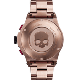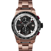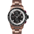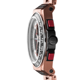 In this Otto Chrono model, a bold statement is made with a solid stainless steel case and 3-link bracelet plated in rose gold, featuring a 2-eye chronograph movement with a black carbon fiber pattern on the dial. Good luck and good timing live a little dangerously close to perfection in this Otto Chrono style.