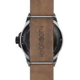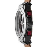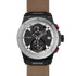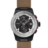 Detailing of an authentic carbon fiber pattern black dial with a 2-eye chronograph movement that forms the numero eight in the dial design are signature to this style. The case is fabricated in solid stainless steel in a fashion-oriented mixed plating combination of black and steel, with a brown artisanal leather strap.