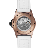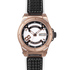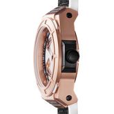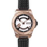This Otto style features a stainless steel case plated in rose gold tone, with a sharp white dial and rose gold indexes and exaggerated “numero eight” on the dial face. The performance-driven strap design is offered in a black and white combination that infuses the model with good fortune, good timing, and great aesthetics.