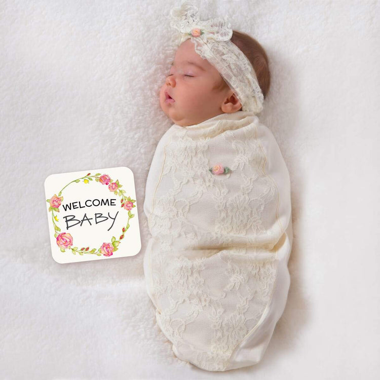 - Includes baby cocoon swaddle, matching headpiece and newborn announcement card.