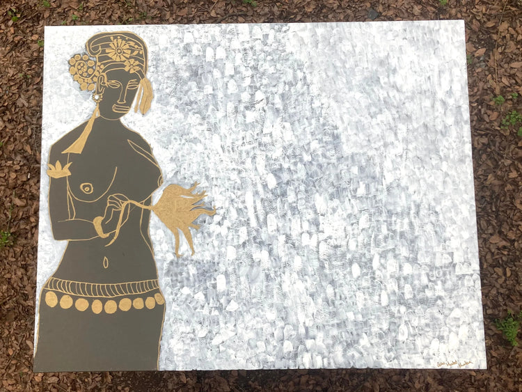 This original artwork combines technique with storytelling. The textured background reflects the depth of winter landscapes, while the golden figure introduces warmth and light. The lotus flower, delicately held, symbolizes purity and renewal, creating a narrative of hope within the icy palette.