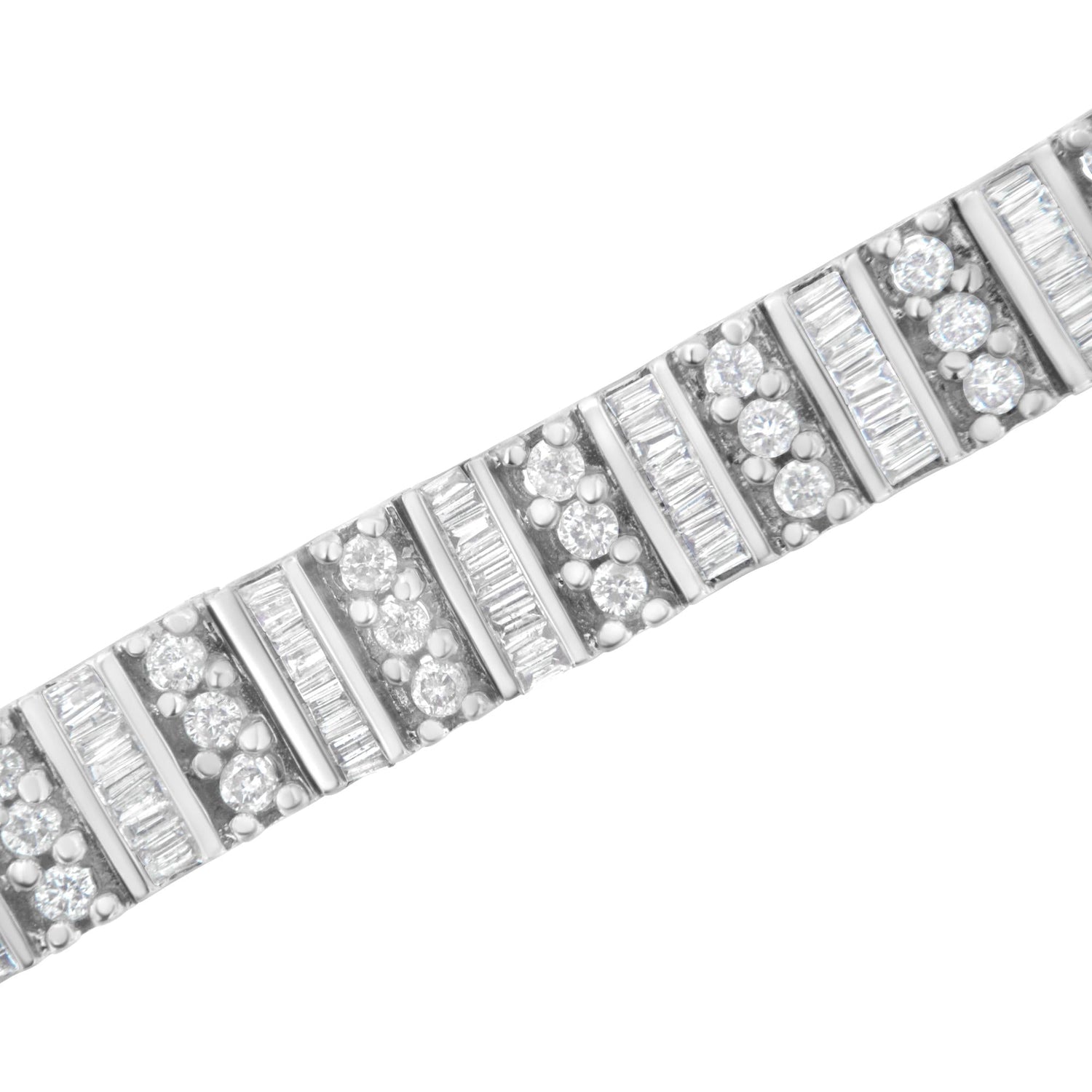 Each link in this exquisite bracelet features two vertical rows of diamonds—a prong-set round cut diamond row positioned beside channel-set baguette cut diamonds. This distinctive design creates extraordinary depth and brilliance, making it a standout piece in any luxury jewelry collection.