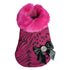 Glamorous animal-print wool coat with luxurious faux fur trims. Adorned with bow with rhinestone buckle. Soft fleece lining. Velcro closures. 50% wool, 50% polyester. Pink.